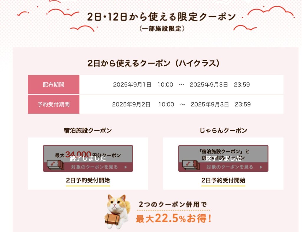 ただし、クーポンは先着順で取り合いになりますので、お得に予約したい場合は、セール前から宿泊日と宿の目星をつけておくと良いと思います。