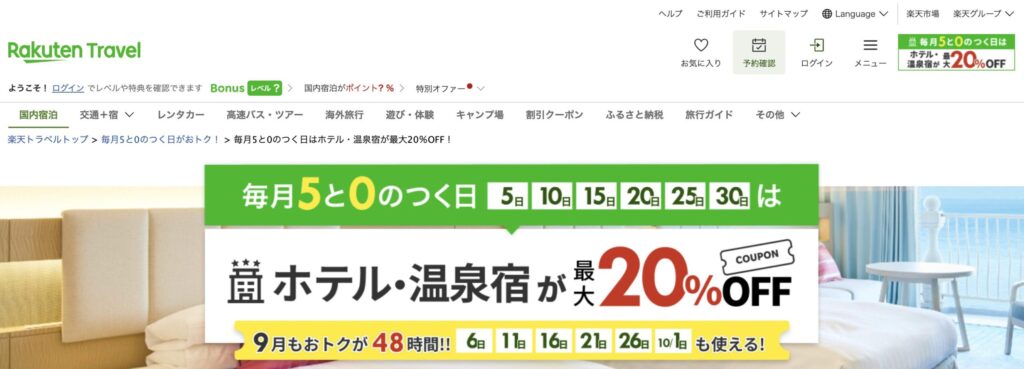 毎月5と0のつく日(5・10・15・20・25・30日)は、楽天トラベルが「ホテル・温泉宿」として掲載する全国の対象や宿の宿泊料金が、限定クーポンの利用で5〜20%OFFになるキャンペーン。